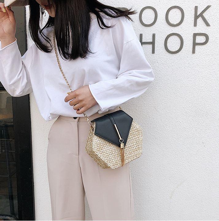 Ce sac hexagone allie le style bohème au style moderne grâce au jeu des matières:
