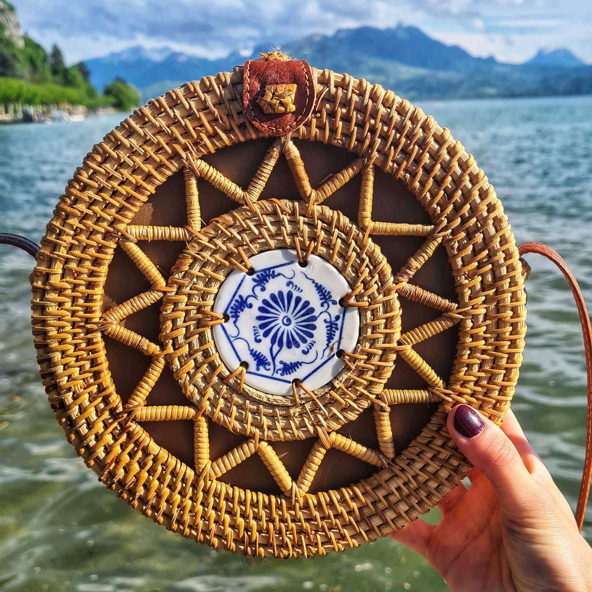 Conçus avec des éléments naturels, chaque sac est unique: Les coloris des bois et de la paille peuvent varier légèrement à certains endroits (plus ou moins marron ou jaune selon les matières). La peinture de la mosaïque est réalisée à la main, les motifs peuvent varier légèrement d'un modèle à un autre.