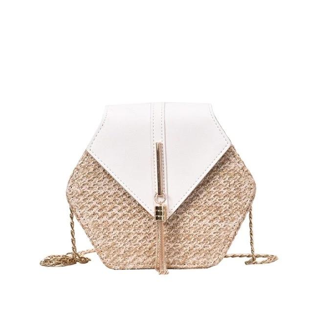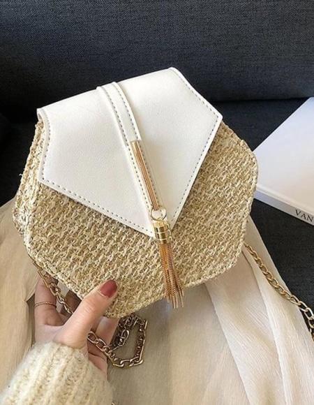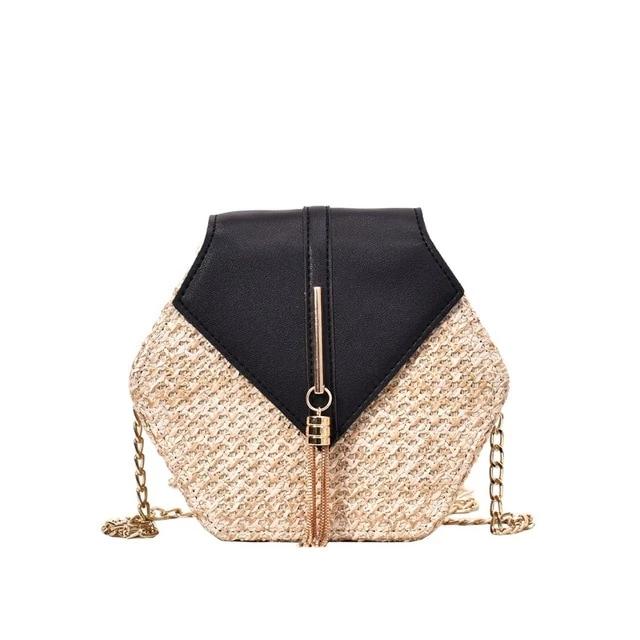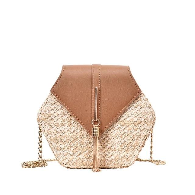 Ce sac hexagone allie le style bohème au style moderne grâce au jeu des matières: